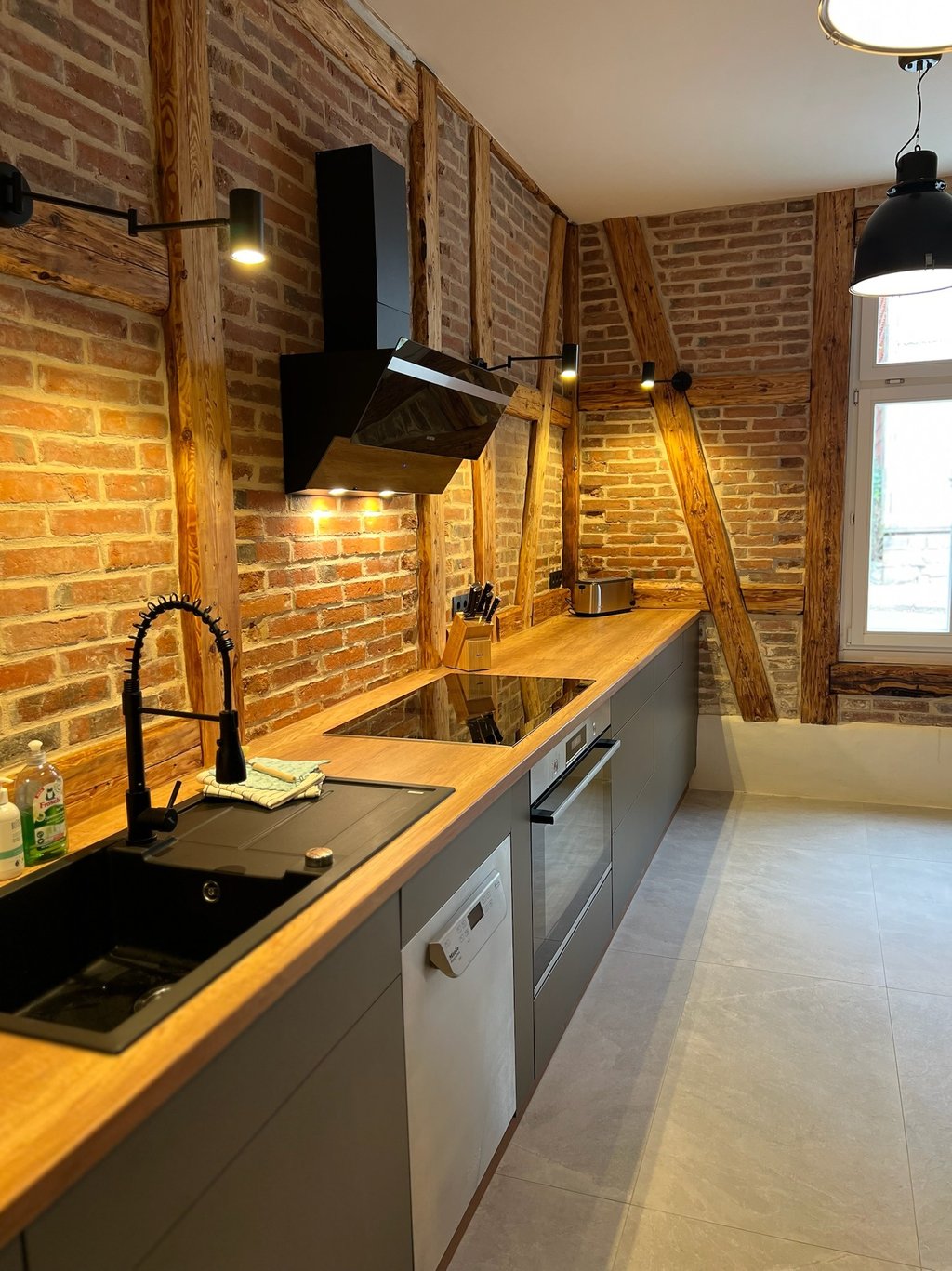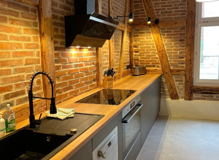 Unsere stilvoll eingerichtete, vom Tischler maßgefertigte Küche ist mit XXL-Gastrogeräten ausgestattet. Dazu gehören sechs Induktionskochfelder, große Töpfe und Pfannen, ein 650-Liter-Side-by-Side-Kühlschrank, eine Gastrospülmaschine mit schnellen Waschgängen sowie eine professionelle Kaffeemaschine. Eine zweite Küche eignet sich ideal als Bar.